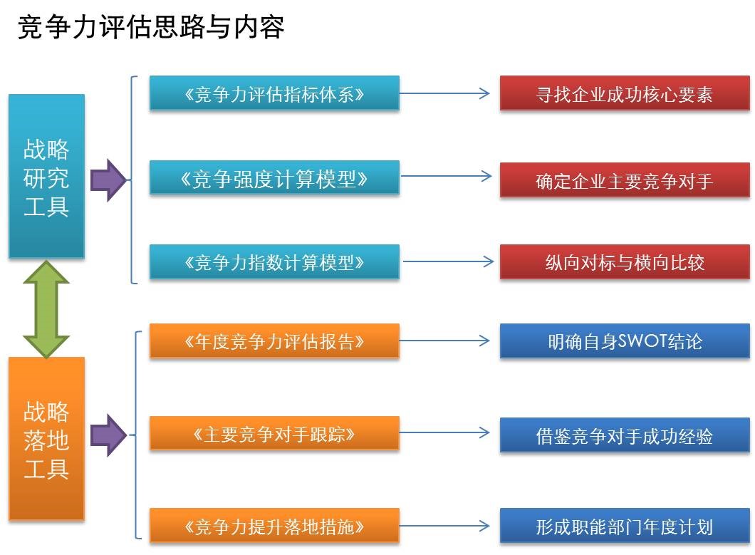 通過與競爭對手及其他國內(nèi)外先進(jìn)企業(yè)的對比,以及的資源與能力分析,提煉行業(yè)內(nèi)企業(yè)成功的關(guān)鍵因素和的比較優(yōu)勢,構(gòu)建的競爭力評價體系、模型和企業(yè)競爭力動態(tài)跟蹤監(jiān)測管理平臺,提供競爭力評價報告模板和與日常工作對接的模式,及時預(yù)報競爭力變動狀態(tài),清晰把握企業(yè)競爭優(yōu)勢、劣勢及其原因,為企業(yè)戰(zhàn)略管理及日常管理提供依據(jù),制定競爭力提升方法和路徑,以提升競爭力為目標(biāo)引領(lǐng)企業(yè)各項(xiàng)工作。